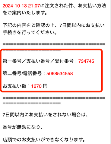 3、支払いの受付番号がメールで確認する
